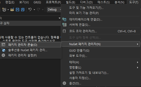 도구 >> NuGet 패키지 관리자 >> 패키지 관리자 콘솔을 클릭하신다음에